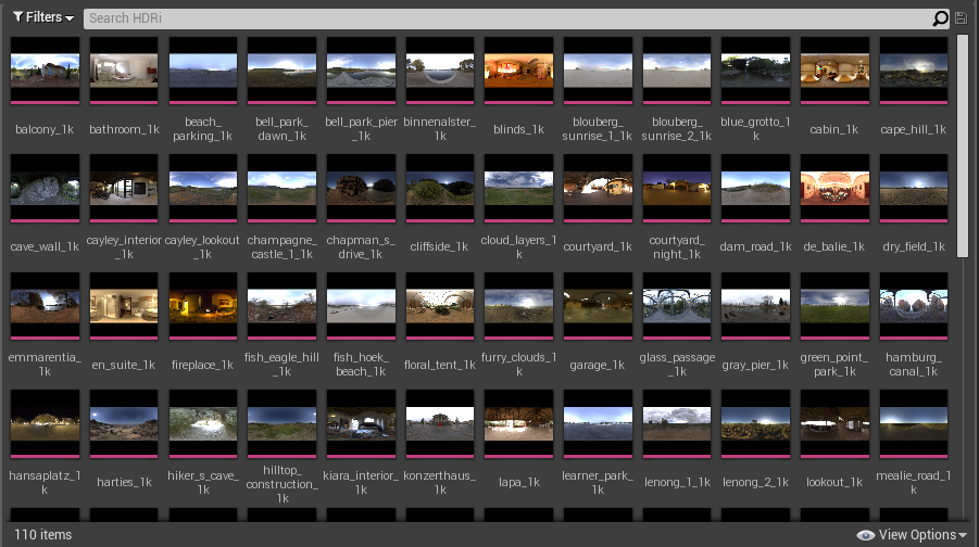 110 free HDRi cubemaps (1024x512) modified to enable use in UE4, compiled from the free samples (CCBY) at hdrihaven.com. Tags are saved as collections so you can find what you want faster.